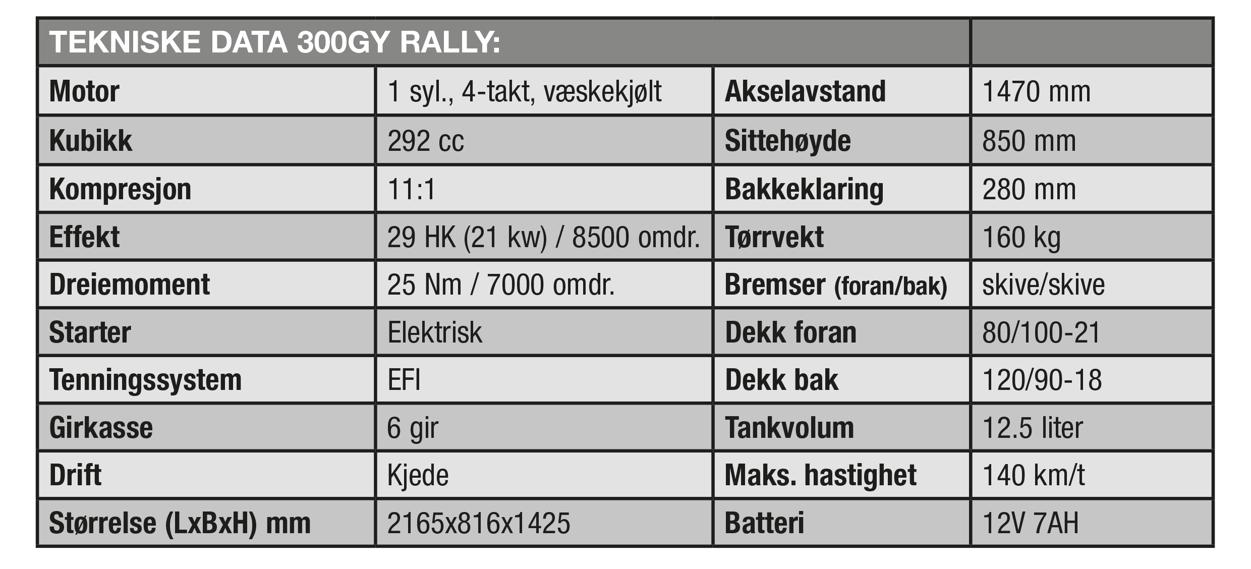 En lett bøllete adventurer som fungerer like bra på vei som offroad. 300Rally er nå utstyrt med ny girsjalter og LED-lys foran og bak. En stabil opp-ned gaffel i front gir lang fjæringsvei. For å kunne fungere godt i utmark har 300Rally hele 28 cm bakkeklaring.