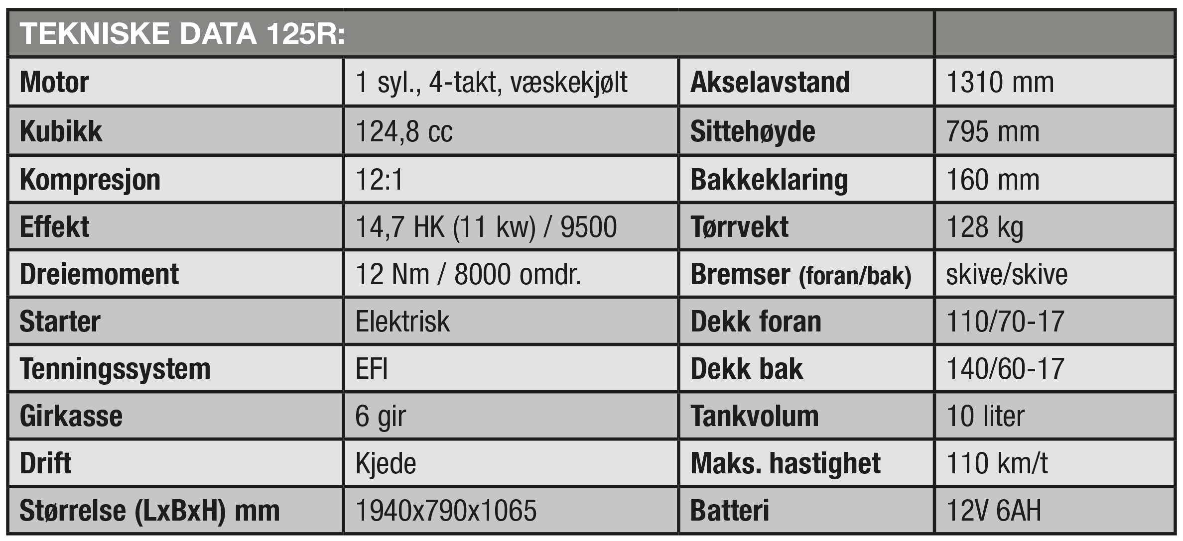 125R har et råtøft design og er utstyrt med oppned-dempere i front, LCD skjerm med hvite bokstaver på svart panel, svingarm i unik stil og LED-belysning. Eksosanlegget er et smykke og det er skivebrems foran og bak. Prøvekjør og du blir overbevist!
